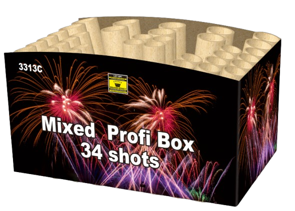 Extreem mooie 34 shots Multi-Shape box met V-Shape, W-Shape en Fan-Shape met 1″inch en 1,2″inch mortierbuizen. WAANZINNIG MOOI!